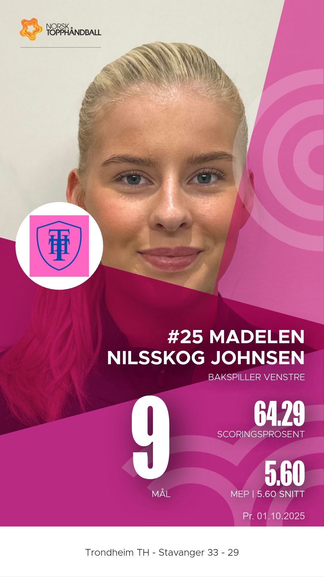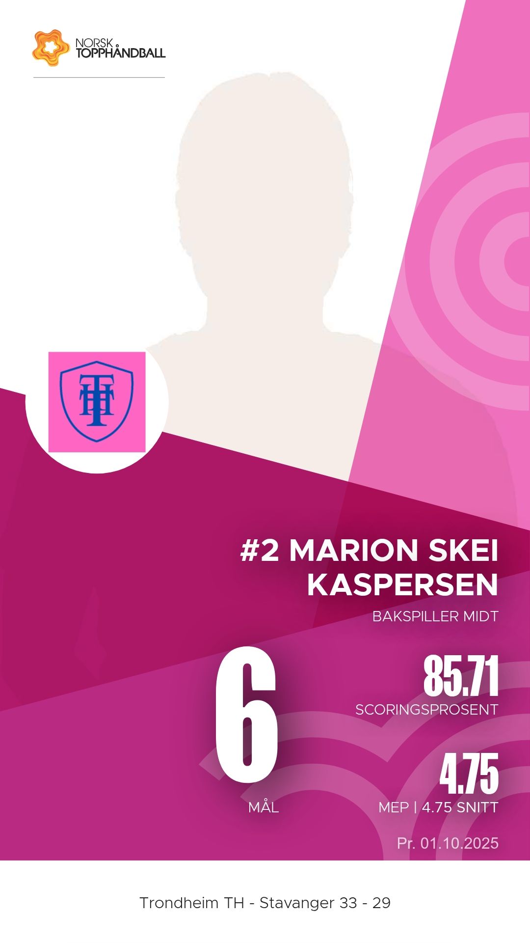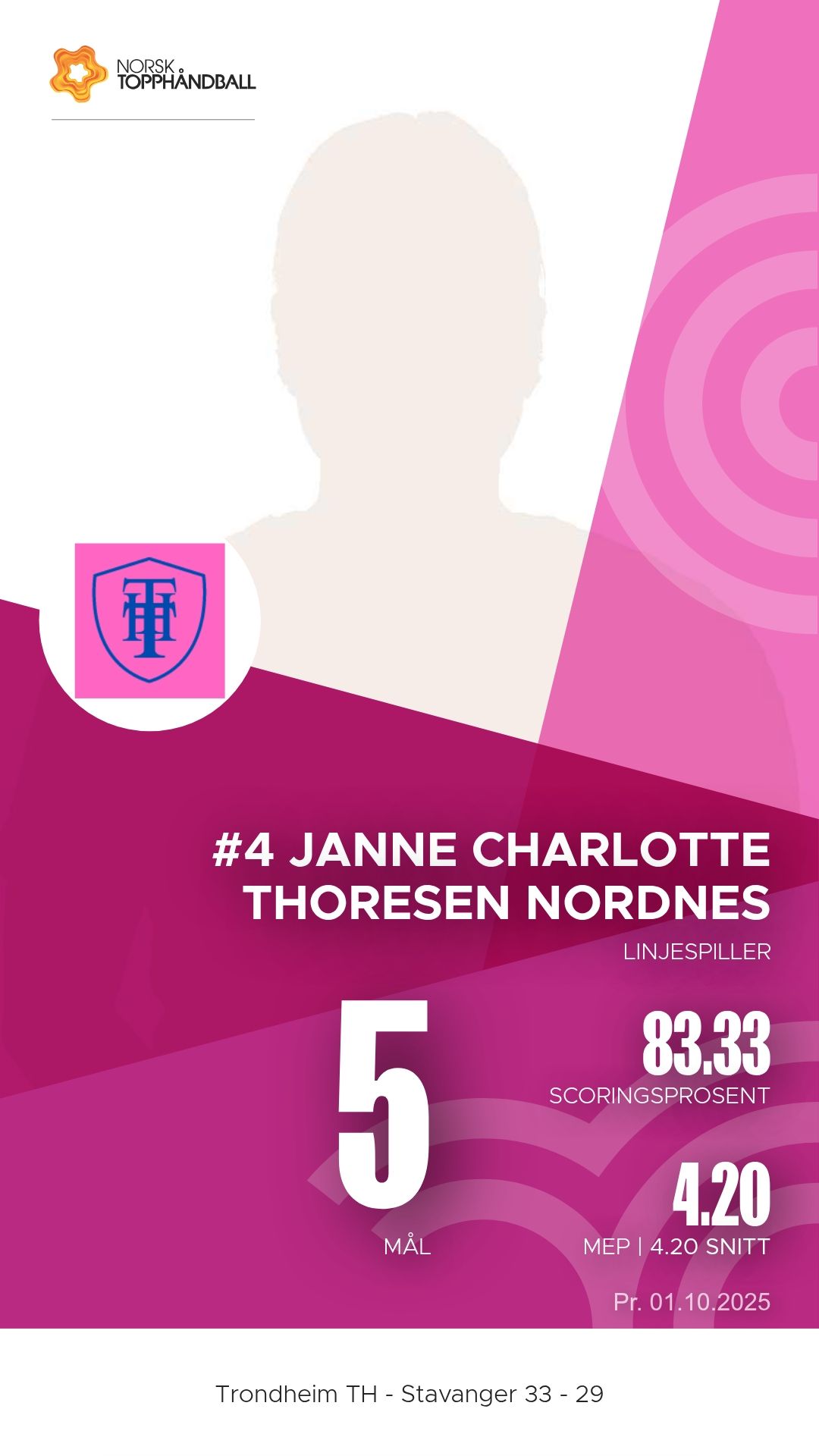 Trondheim Topphåndballklubb tok imot Stavanger i Husebyhallen onsdag 1. oktober 2025 i en kamp i 1. divisjon sesongen 2025/2026. Oppgjøret endte 33–29 etter at hjemmelaget hadde et lite overtak gjennom store deler av kampen, men Stavanger viste flere sterke perioder og presset vertene hardt.
